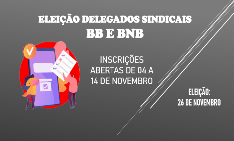 A partir desta terça-feira, dia 4 até o dia 14 de novembro, os bancários do Banco do Brasil e do Banco do Nordeste, interessados em participar das eleições para delegados sindicais 2025, podem acessar o site do Sindicato para fazer sua inscrição no pleito. Para facilitar o acesso, as inscrições poderão ser através de formulário eletrônico disponível nos links abaixo.