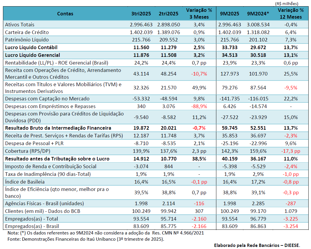 O Itaú Unibanco registrou um lucro líquido gerencial de R$ 34,5 bilhões nos nove primeiros meses de 2025, alta de 13,1% em relação ao mesmo período do ano passado, segundo levantamento do Dieese com base nas demonstrações financeiras do banco. O resultado confirma a trajetória de crescimento dos lucros e da rentabilidade da instituição, que atingiu 23,9% sobre o patrimônio líquido.