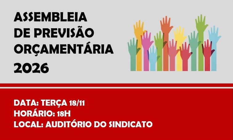 O Sindicato dos Bancários de Campina Grande e Região convoca seus associados para assembleia de Previsão Orçamentária a ser realizada na terça-feira, dia 18 de novembro, a partir das 18h, no auditório do Sindicato, na rua Venâncio Neiva, 187 - 2º andar - centro, Campina Grande.